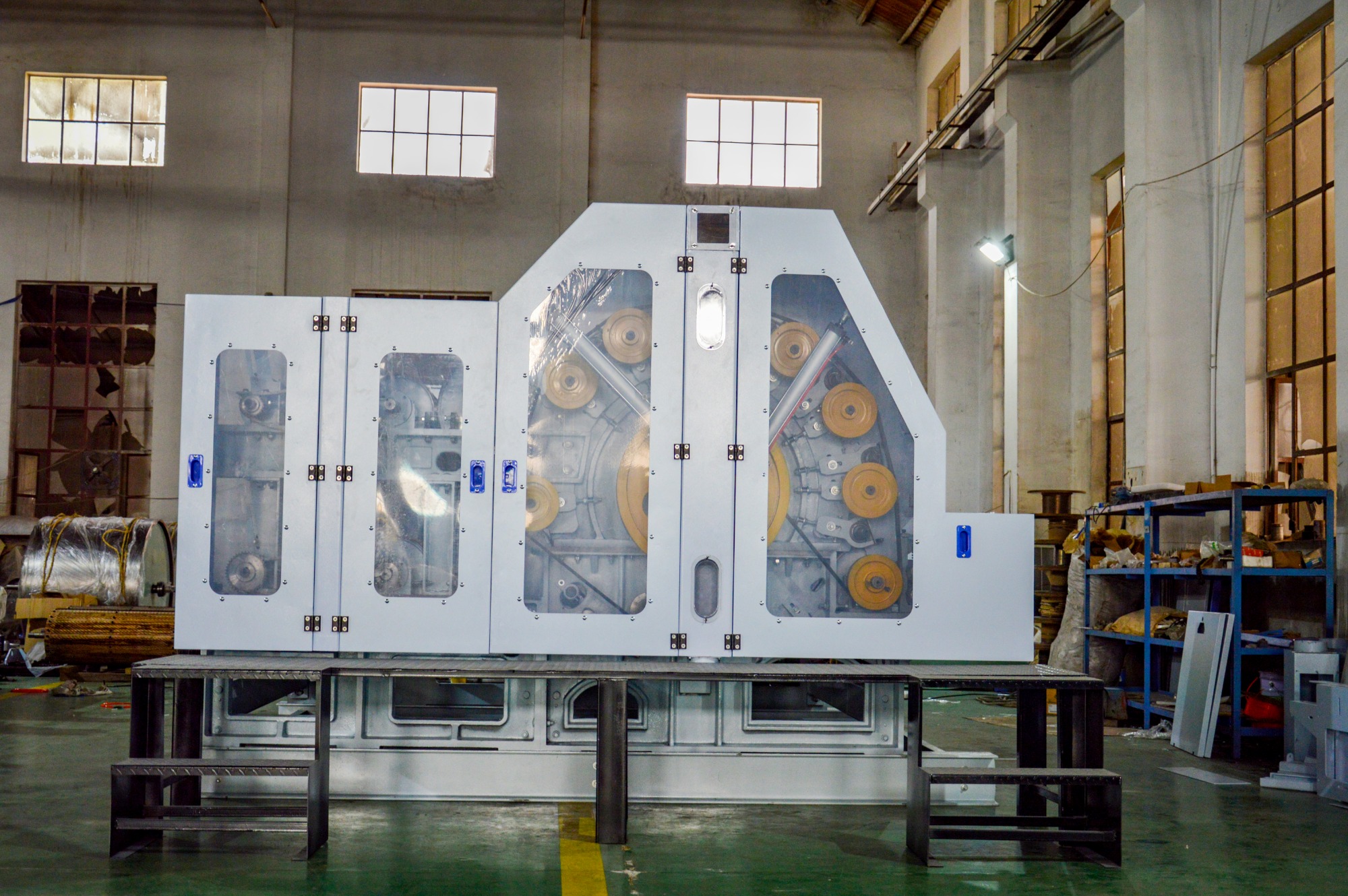 兩側機架由鑄件結構,中間由型鋼支撐,結構穩固。